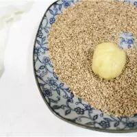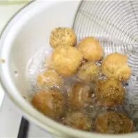 10. 油加热到七分热时 将醮了芝麻的面团放入 小火炸到开口 再转为大火炸至金黄 捞出后 沥