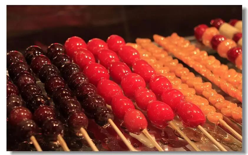 4、此时可把预先穿好的山楂串放放糖锅中,滚一圈粘满糖液,拿出放在抹上食用植物油的木板上,用力摔一下,这样做出糖葫芦有一个明显的大糖片,很美观。