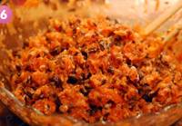 6. 把木耳碎和胡萝卜碎放到肉馅中,用盐调味后,搅拌均匀,淋上香油封住香味。
