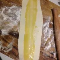 4. 面团醒发后分适量等分面团,将面团擀至成长条牛舌状抹油酥适量。