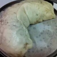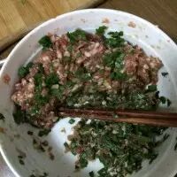 揉到表面光滑之后盖好发酵至2倍大,大约需要1小时,如图!2. 搅拌肉馅!葱切末放入,将所有粉类、水质类调味料都放进来,分次倒入麻椒水按照一个方向打!最后放入所有油类调料(葱油,蒜油,香油)锁住水分!此时香味扑面而来:D
