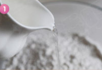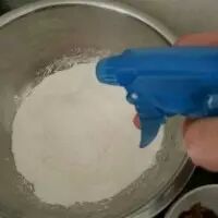 2. 一手搅拌,一手用喷壶向面粉中喷水,使粉料均匀打湿即可。如果有小疙瘩,要用手搓开。