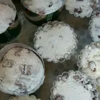 6. 蒸帘上放润湿的屉布,然后放上模具,圆形的我是易拉罐剪成的圆圈做成的模具,花瓣的是蛋挞模具,手里有什么模具用什么模具不限。将模具刷上油,用小勺舀粉料填在模具中即可,千万不要压实,表面轻轻摊平即可,凉水上锅蒸二十分钟即可脱模,倒扣摆盘即可。