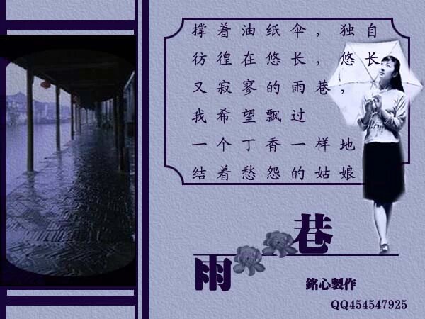 [ft=#ff00ff,,]撑着油纸伞,独自 彷徨在悠长、悠长 又寂寥的雨巷 我希望逢着 一个丁香一样地 结着愁怨的姑娘 她是有 丁香一样的颜色 丁香一样的芬芳 丁香一样的忧愁 在雨中哀怨 哀怨又彷徨 她彷徨在这寂寥的雨巷 撑着油纸伞 像我一样 像我一样地 默默彳亍着 寒漠、凄清,又惆怅 她默默地走近 走近,又投出 太息一般的眼光 她飘过 像梦一般地 像梦一般地凄婉迷茫 像梦中飘过 一枝丁香地 我身旁飘过这女郎 她静默地远了、远了 到了颓圮的篱墙 走尽这雨巷 在雨的哀曲里 消了她的颜色 散了她的芬芳 消散了,甚至她的 太息般的眼光 丁香般的惆怅 撑着油纸伞,独自 彷徨在悠长、悠长 又寂寥的雨巷 我希望飘过 一个丁香一样地 结着愁怨的姑娘 [/ft]