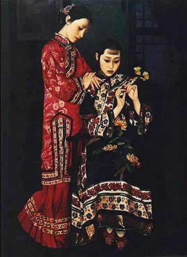 七夏看着画布上的女子。漆黑的长发,大红色绸缎碎花长袖。脚上一双绣花鞋。坐在门坎上侧过身子背靠着门沿,头微微下垂,看不清整个面目与表情。背景是一个有些年代的大屋。