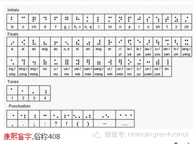 有位中国盲教员(据说是山东人,叫朱德光;另一种说法是一们姓沈的盲教员和外国传教士合作),将盲字排出北京话的全部音节四百一十多个,人们称它为“康熙盲字”(也称北京盲字“或协和盲字”)。这是最早的汉语盲文的开端.