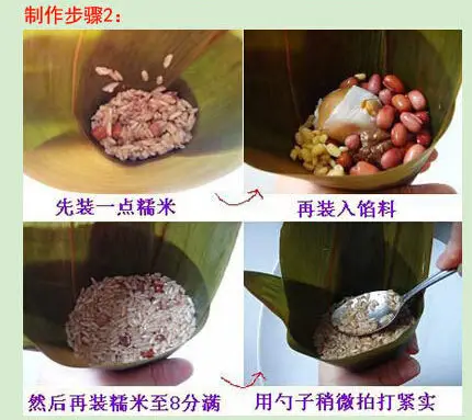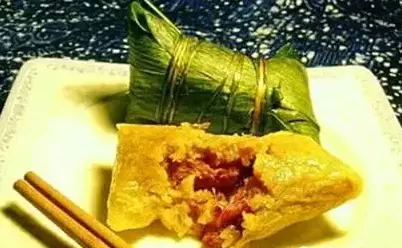 烹饪方法:白糯米泡在冷水里三四个小时,然后按照一层米、一层馅的顺序,一共包裹上三层米、三层馅,最后将这些原料用芦苇叶包裹起来,煮熟了即可。