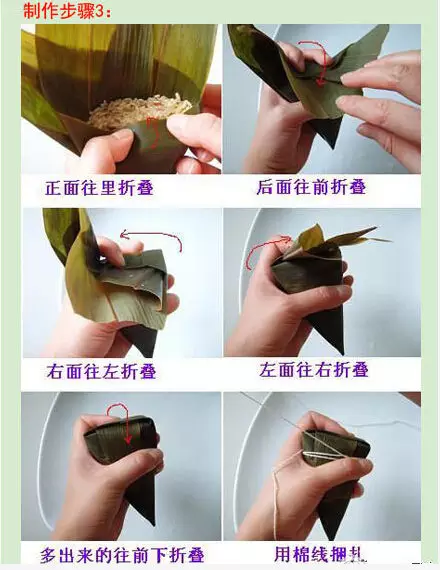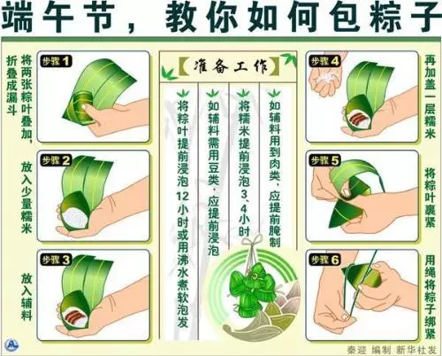 5. 包粽子要注意四周平衡,两端大小相似,扎绳不能扎死,不能打结,以八成紧为宜;