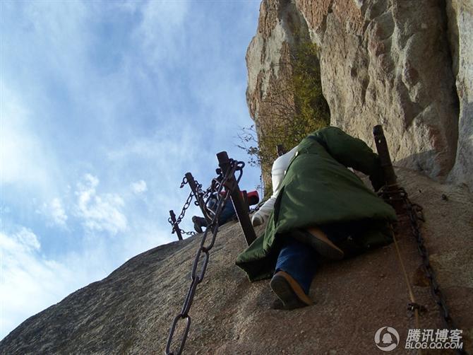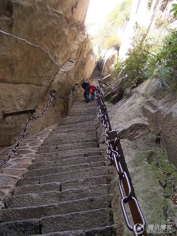 (小上方。上方,意为神仙住的地方。上面那个道观是在岩壁上凿洞而成,华山上有很多这种道观神庙,往往凿一个花费数十年。这个现在建的石阶已经相当豪华了,整齐、足够宽和深、有铁索,仅仅坡度遥似当年。)