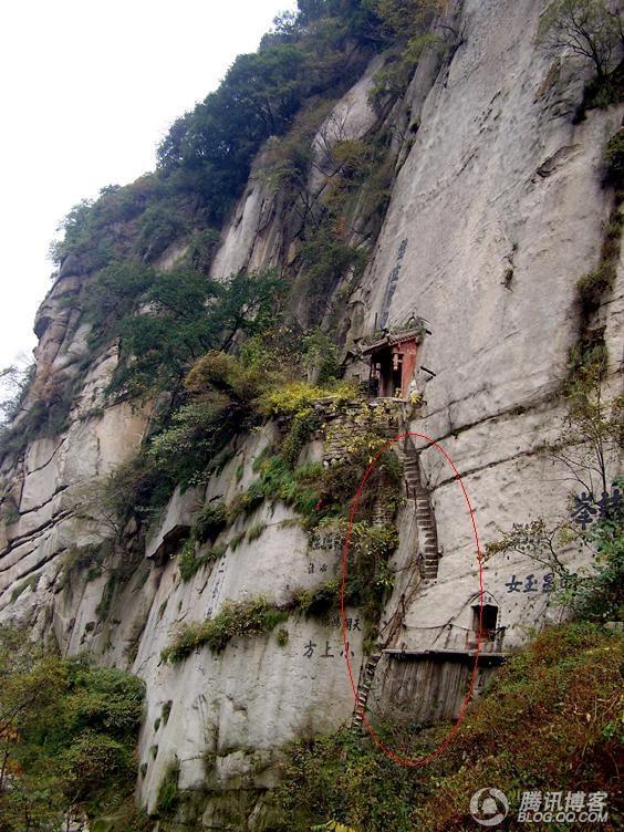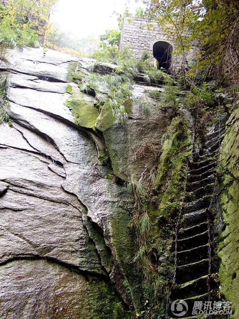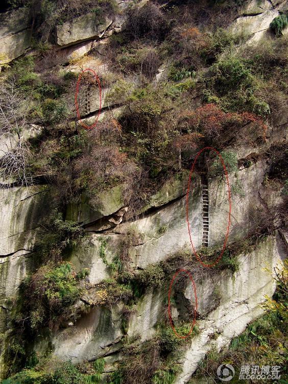 (看看上图中的三个红圈,内为古阶。90度上下,有些非常淺,没有护手,下为山谷。这是上山途中第一个看了后背发凉的地方,太景仰古时那些老道了!)
