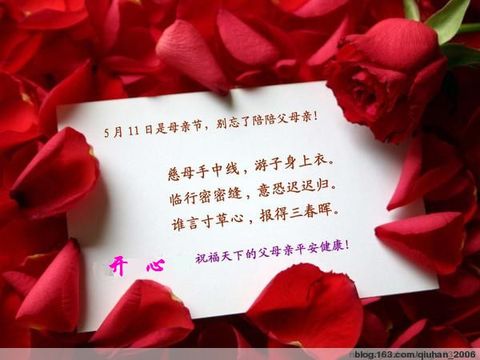慈母手中线,游子身上衣,临行密密缝,意恐迟迟归,谁言寸草心,报得三春晖…… 朋友,母爱永远是伟大的,母亲的爱是博大的,母爱永远也是无私的, 一直以来,母亲为我们遮风挡雨,分享我们的喜悦,分担我们的忧愁;体谅我们的难处,包容我们的疏忽。 今天,在母亲节又快到来之即,在这温馨的日子里,为母亲放声高歌一首:《游子吟》:“慈母手中线,游子身上衣,临行密密缝,意恐迟迟归,谁言寸草心,报得三春晖…… ”,道出了我心中对母亲的崇高敬意,以及世上千百年来,对母爱伟大无私的吟颂。