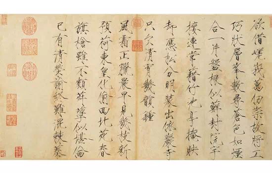 【赏析】徽宗在艺术上有多方面的成就,能书善画,书法称“瘦金体”。此《欲借风霜二诗帖》是纸本,楷书,33.2 x 63公分。台北故宫博物院藏。由两首七言与五言律诗合并而成,也名为“欲借、风霜二诗”帖。