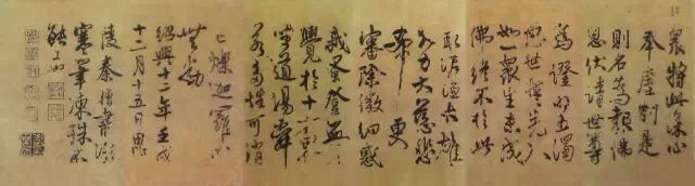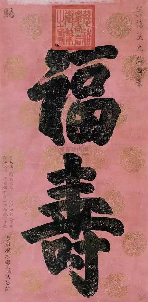 【赏析】“望隆梅鼎资调燮,宠渥芝纶介寿康”。这件作品用笔粗壮厚重,装裱华丽大气,较为恰当地显示了慈禧太后的特殊地位与作品内容的喜庆色彩。
