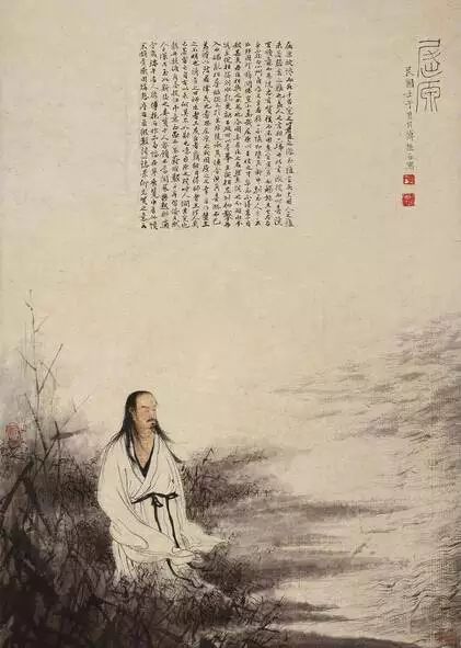 【赏析】画中的屈原昂首独行,瑟瑟的秋风,吹拂着他的头发和衣衫。身后是芦苇丛生的江潭泽畔,前方是苍茫浩瀚的汨罗江水,他“宁赴湘流”,也决不“蒙世俗之尘埃”。画家以精细的线描用心勾画了屈原的形象,而将大片画面让与江水,使得观者在聚焦屈原的同时,感受到一种孤独无助的悲凉。
