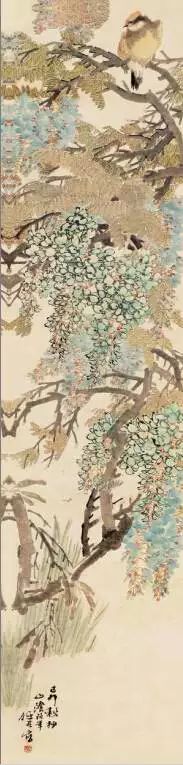 【赏析】紫藤栖莺笔致放松,写味十足,水、墨、色的交融变化处理得尤为自然,形成了一种诗意盎然的抒情调子。任氏重视继承传统,吸收西画的速写、设色等技法,形成风姿多彩的独特画风,当之无愧为近百年海上画派之巨擘。