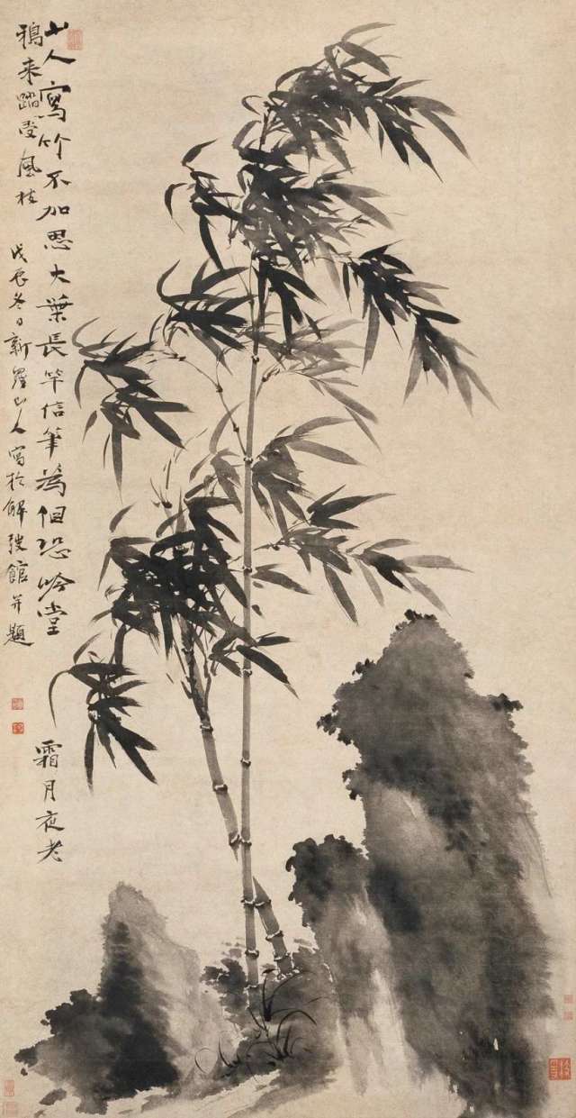 【赏析】华嵒是清代雍正、乾隆时期成就最高的画家之一。画中有“山人写竹不加思,大叶长竿信笔为。但恐吟堂霜月夜,老鸦来踏受风枝。”简短四句诗,表现出画家豪放不羁的情怀。画面可谓精当简洁,湖石瘦而透,出于随意变化的湿而整的笔致,修竹新篁,笔意隽逸。