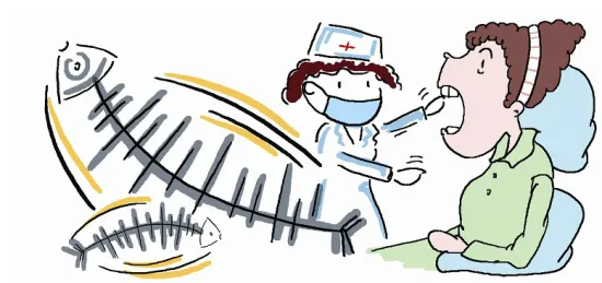 吃鱼时被鱼刺卡住,最初的位置一般都比较浅,最常见的就是在扁桃体附近,如果及时就医或夹出很容易解决。相反,采用吞食物等土办法,会把鱼刺越挤越深,刺入黏膜内,同时也可能把鱼刺推入咽喉部、食管,导致鱼刺更难取出。另外咽喉食管周围有许多大血管,鱼刺刺伤血管后可造成大出血,或者刺破黏膜造成感染、化脓、形成脓肿,最后可引致感染危机性命。面对孩子卡鱼刺,妈妈应该怎样做?