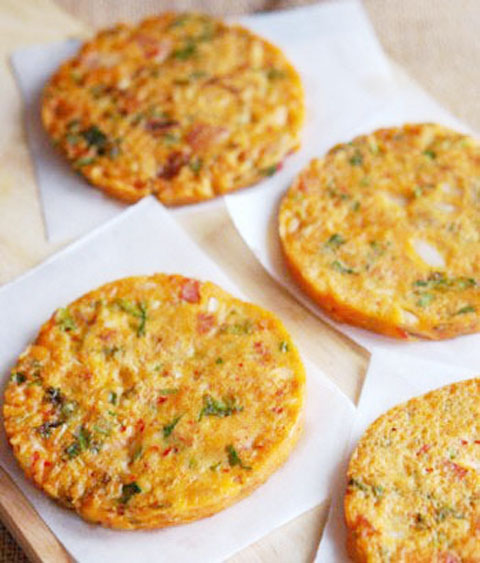 4.锅中放入模具,在模具中滴入少许底油,舀一勺面糊填充满模具,可以适当用勺子压一压,摊至两面金黄即可~