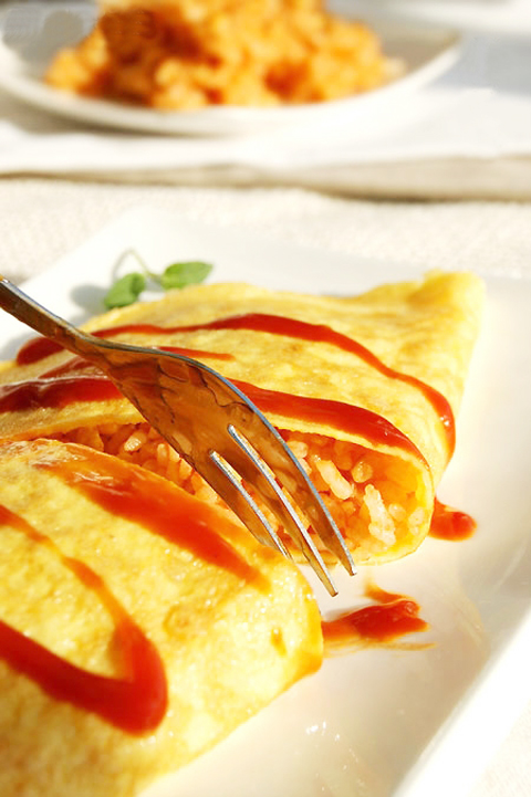 2.一枚鸡蛋打散,放入锅中炒散,加入火腿丁、豌豆、米饭炒均匀,撒少许盐以及番茄酱出锅;