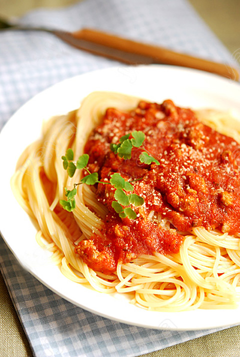 6.放入肉末一同翻匀(喜欢黑胡椒的同学可再撒点黑胡椒粉),将煮好的意面放入酱汁拌匀装盘即可(注意,不是把酱放在面上,而是把面放入锅中炒一下再拌匀)~