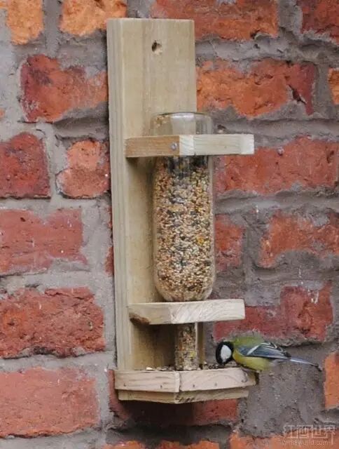 给你花园里的小鸟们一个福利吧。只要在酒瓶里装上鸟食,倒立起来安装在木质固定器上,在瓶口处保留适量的空间让鸟食可以流出来就行。