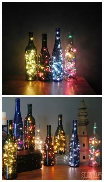 用瓷砖研磨器在瓶身上仔细凿出一个3/4英寸的孔,然后把一串灯饰放到瓶子里,把灯点燃,整个瓶子看起来就会像圣诞树一样炫目。