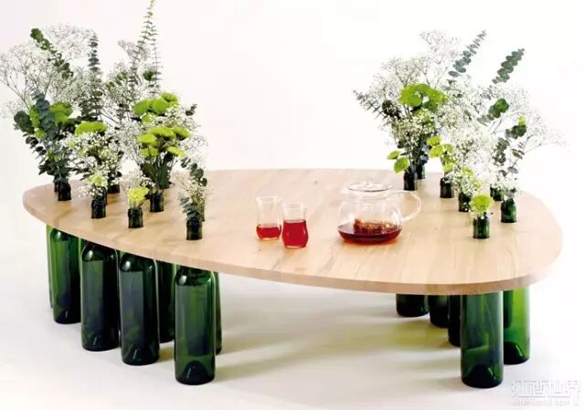 对于一些比较具有冒险精神的DIY朋友,你可以以酒瓶为支撑,制作一个低矮的咖啡桌,桌子上再装饰一些花草叶子。