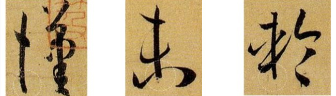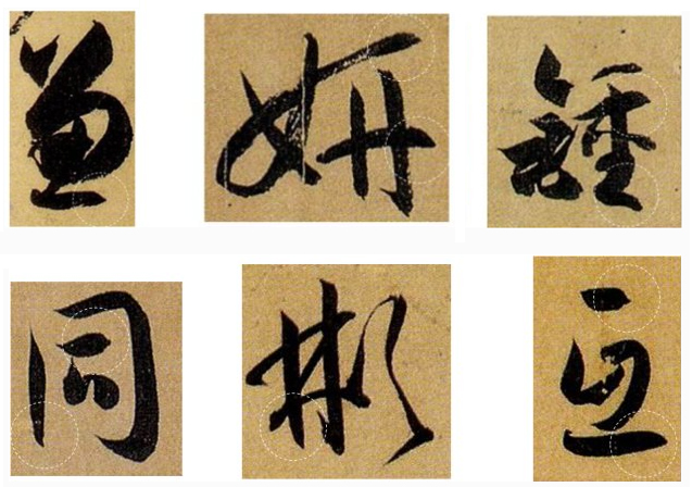 入笔的角度变化很多,几乎各个角度都有,需要仔细观摩,找准入笔角度对接下来的行笔动作有很大帮助。变化太丰富,不能一一列举,读帖时要细致观察。