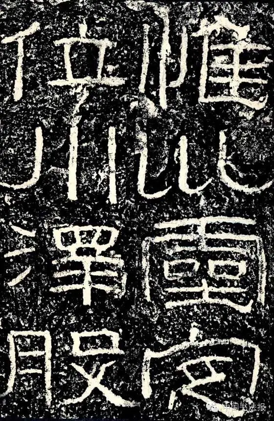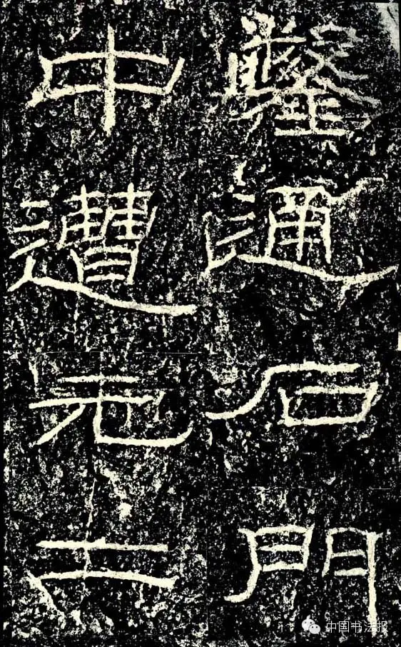 过去有汉隶的偏旁多呈独立存在之说,这大概是与行草书相对而言。其实,每一偏旁的处理都要考虑与其相对部分的关系,而作相应的调整,这在《石门颂》中显得尤为突出。譬如“诚”字的“言”旁,“口”有意向左下拉出,这样单看“言”本身就失去了重心,但与右边“成”的取势恰成呼应,使整个字显得稳而不板;“明”字的“目”旁下部明显向右倾斜,而“月”却有意向左取势,使全字既稳住了重心,又顿生妙趣;“凿”字的“殳”写得很扁,下部形成的空显然偏右,而“金”大胆地补入空中,再用撇放捺敛的特殊手段救之,包括下部几笔一同向左取势,使整个字斜而不倒,奇趣横生。此类例字随处可举,无须一一罗列,其关键所在是有意制造矛盾或者说是造险,而后解决矛盾或者说收拾险情,从而写出新景象。当然,这种本领更要慢慢锻炼体验,不可操之过急。