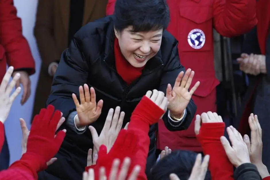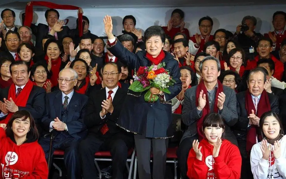2012年12月19日,韩国大选投票结束,朴槿惠在党总部庆祝赢得胜利,成为韩国首位女总统。