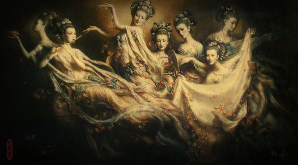 莫高窟俗称千佛洞,有“东方卢浮宫”之称。莫高窟虽然在漫长的岁月中受到大自然的侵袭和人为的破坏,但敦煌壁画容量和内容之丰富,是当今世界上任何宗教石窟、寺院或宫殿都不能媲美的。环顾洞窟的四周和窟顶,到处都画着佛像、飞天、伎乐、仙女等。有佛经故事画、经变画和佛教史迹画,也有神怪画和供养人画像,还有各式各样精美的装饰图案等。真可谓是:天衣飞扬,满壁风动!