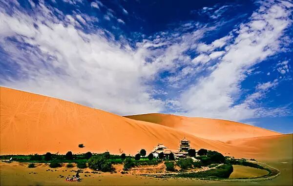 历来水火不能相容,沙漠清泉难以共存。但在这里,你却能看到沙漠与清泉相伴为邻的奇景,这就是鸣沙山月牙泉。它们是大漠戈壁中一对孪生姐妹,位于敦煌市西南5公里处,自汉朝起即为“敦煌八景”之一。鸣沙山有一个奇特的现象,因为地势的关系刮风时沙子不往山下走,而是从山下往山上流动,所以月牙泉永远不会被沙子埋没,被称为沙漠奇观。