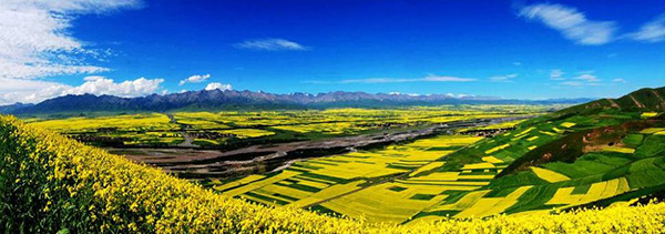 门源的油菜花因为季节原因,每年7月中旬才进入盛花期,这里的油菜面积高达2万公顷、50多万亩!在高原上常见的蓝天白云和祁连雪山的衬托下,油菜花沿浩门河两岸形成了博大壮阔的特有奇观:一望无际的金黄显得异常斑斓,像一幅巨型画卷,近百万亩大色块的简单构图具有十足的西部风味,铺天盖地,给人丰富的遐想。它也因此赢得了“全球十大绝美花海”的美誉。