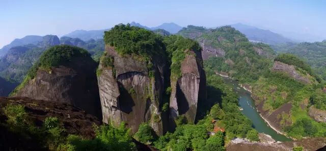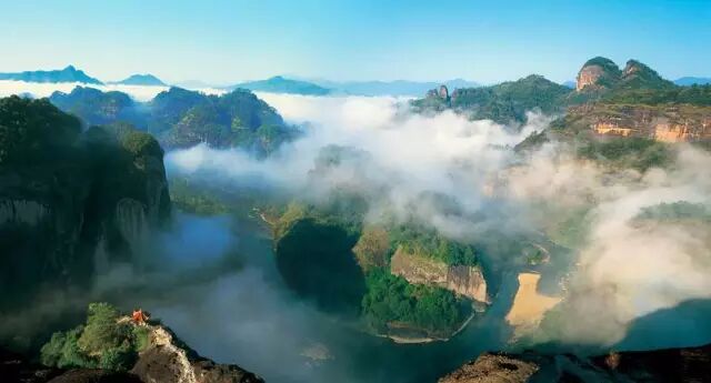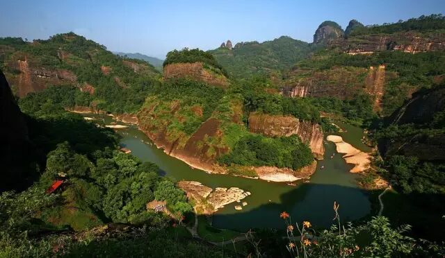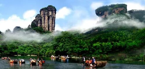 武夷山集山岳、河川风景于一身,在山与水的紧密结合、人文与自然的和谐统一上达到绝妙的境界:清澈碧绿的九曲绕山而行,曲折萦回;发育典型的丹霞地貌千姿百态;以架壑船棺为象征的古越族文化,以城村古汉城为标志的西汉文化,以朱熹为代表的宋朝理学文化,令人叹为观止;游人乘坐古朴轻巧的竹筏顺溪而下,既可饱览武夷溪光山色、瞻仰两岸文化古迹,又可享受诗情画意、领略惊险刺激。