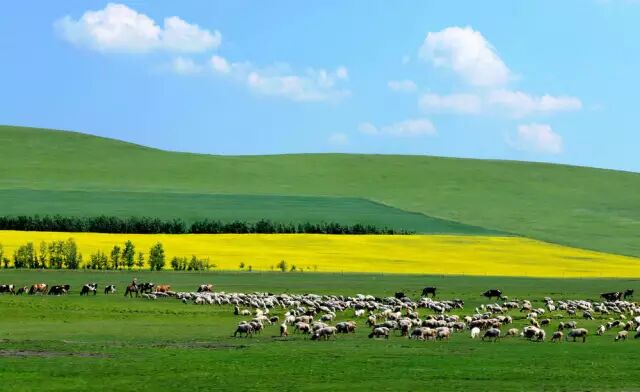 蓝天,白云,草原,湖泊,森林,小镇,村庄……所有的一切,都是那么地辽阔,站在这片土地上,你自然就会希望,成为一个真正的牧民,在马背上豪情万丈地放声歌唱,或者成为一只长空的雄鹰,肆意地翱翔在上天恩赐的纯洁空气里。在这片地域辽阔、风光旖旎的地方,有水草丰美的草原、松涛激荡的大兴安岭林海……走进这样一幅绚丽的画卷,你只愿做一只草原上幸福的小羊。