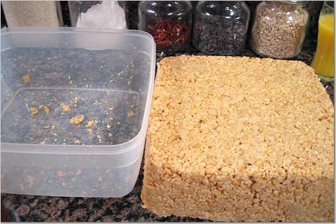 将搅碎的豆子放入一个四方形的盒子。用力的压豆子,然后将盒子翻扣,慢慢得让豆子滑出来 。