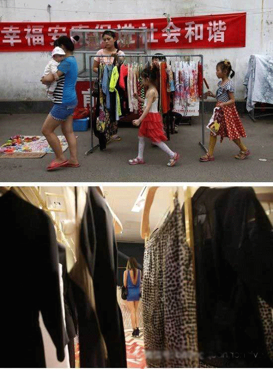 (上)北京一个主要面向农民工的市场,小贩在街头兜售女装。