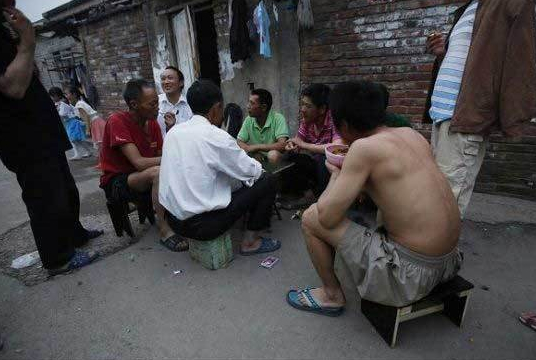 (上)北京一个农民工的住宅区里,居民们在胡同里的路灯下赌博。