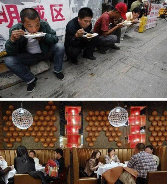 (上)在街上花大约1.6美元(10元人民币)吃午饭的男子。