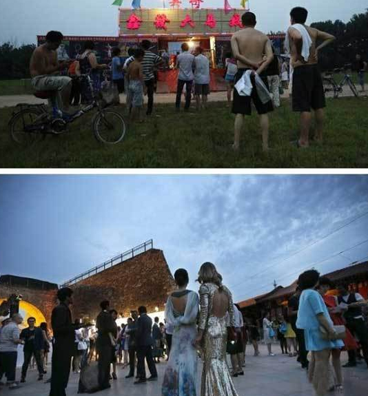 (下)北京明城墙遗址公园,名流和嘉宾在参加一场时装秀前的招待会。