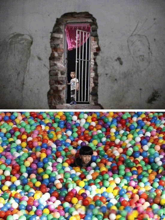 (下)北京一个富人区里,一个男孩在儿童室内游乐场里玩耍。