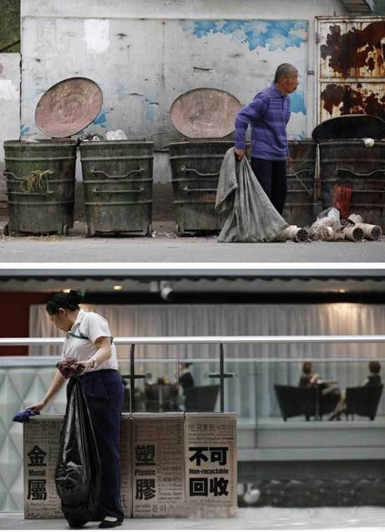 (上)在外来民工的居民区里,一位老人在垃圾桶里寻找可以回收的垃圾。