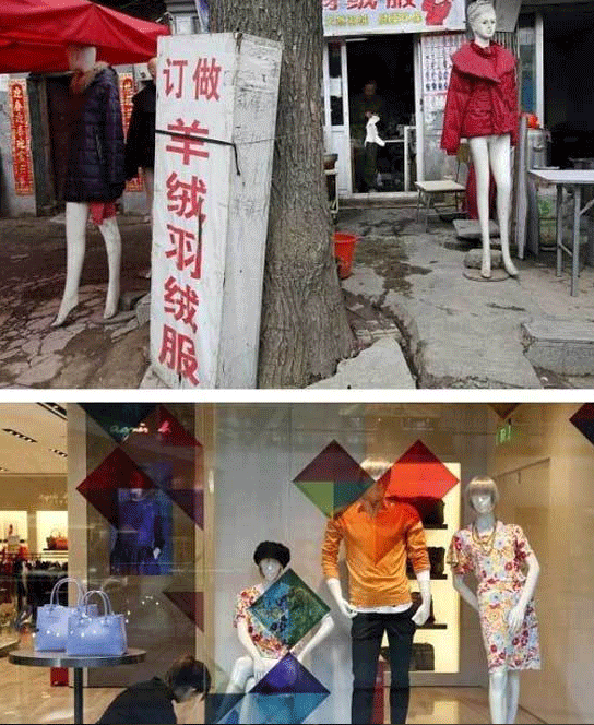 (上)在北京,主要面向为外来民工的商店外摆放的模特。