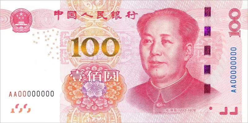 3.票面右上角面额数字由横排改为竖排,并对数字样式做了调整;中央团花图案中心花卉色彩由桔红色调整为紫色,取消花卉外淡蓝色花环,并对团花图案、接线形式做了调整;胶印对印图案由古钱币图案改为面额数字“100”,并由票面左侧中间位置调整至左下角。
