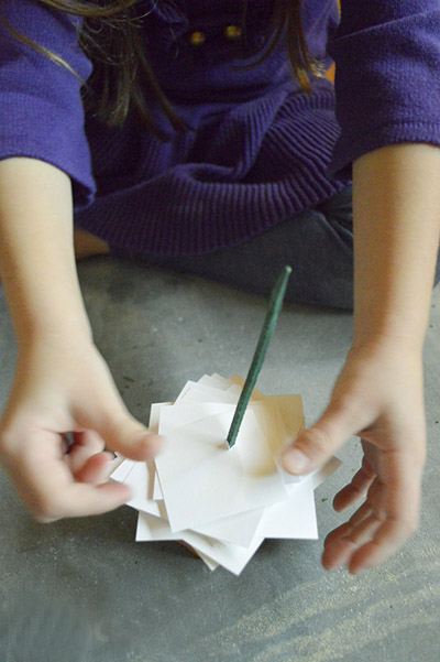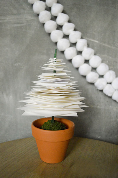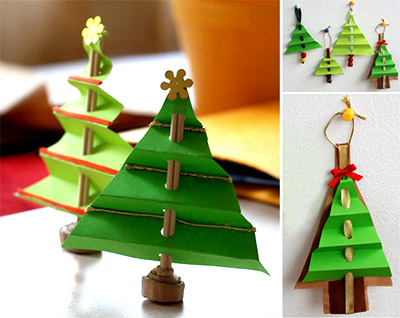 3. 折叠圣诞树,你需要准备绿色卡纸,小木棍(木筷也行)和打孔器