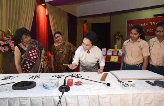 彭丽媛教印度学生写毛笔字