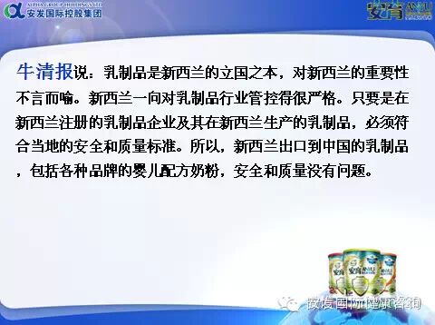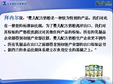 【安育奶粉】在包装前严格进行成分解析、质量和安全检验,最后才以净重为900克的罐装品原罐原装运至中国。加工厂及出口商必需要有新西兰初级产业部(MPI)批准的出口证及风险管理计划,同时拥有英国SGS BRC 的世界食品安全证,ISO 9001及ISO 22000。