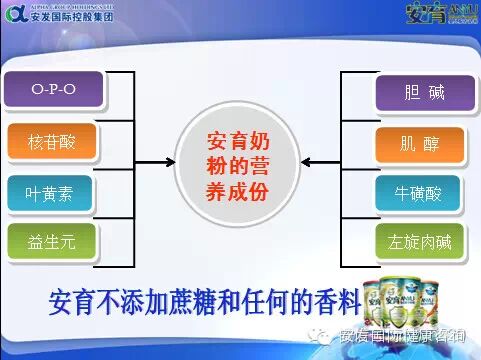 【安育奶粉】配方原则,参照母乳的营养结构,根据中国婴幼儿配方食品的国标进行配方,不添加香精香料。新鲜原奶运用欧洲最先进的喷雾干燥技术生产,确保奶粉的质量,且加热环节能确保产品的安全性严格把控。