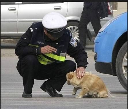 43.【 武汉闹市区的十字路口,一小狗过马路时被车流斩断去路,它可能吓坏了。停在路中一动不动。这时,一位jc上前轻抚其头部,并带狗狗离开马路中央、】