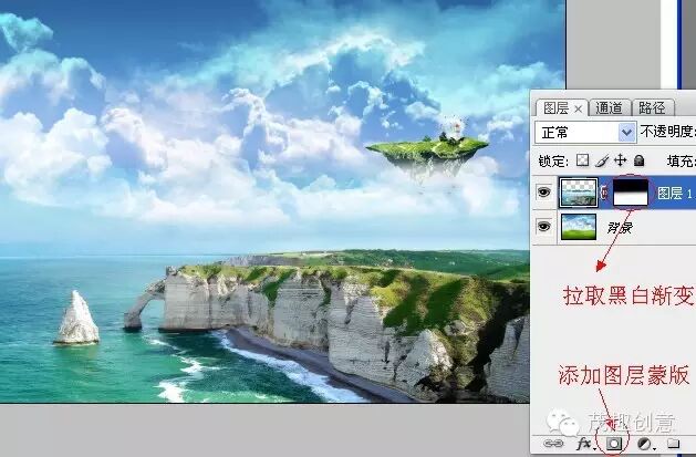 ►对图层添加蒙版后,在蒙版中拉取一个黑白渐变